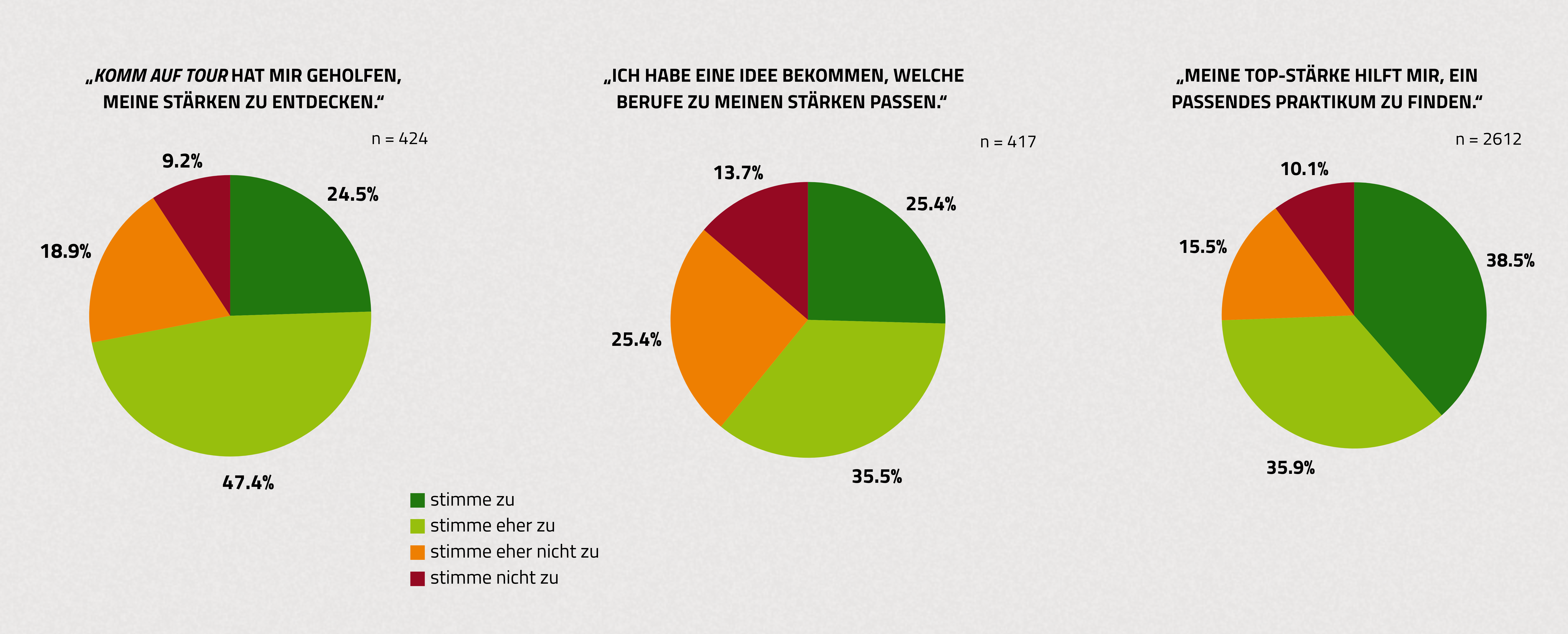 In diesem Sinne können wir ein erstes Fazit zur Wirkung des Projekts „komm auf Tour – meine Stärken, meine Zukunft“ und seinem Erlebnisparcours ziehen. Mit Blick auf unsere zentralen vier Wirkungsziele auf der Outcome-Ebene zeigen die Ergebnisse der Erhebungen, dass unsere Arbeit wirksam ist. Der Großteil der Schüler:innen konnte durch die Teilnahme an „komm auf Tour“ ihre individuellen Stärken erkennen, diese auf mögliche Berufsfelder beziehen und erste Orientierungspunkte für Praktika entwickeln.