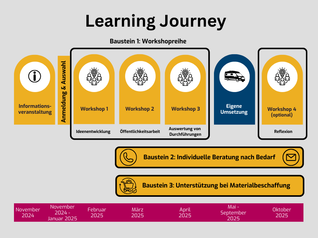 In bis zu vier Workshops erhalten die teilnehmenden Kommunen praxisnahe Impulse zu Ideenentwicklung, Einsatzvorbereitung, Öffentlichkeitsarbeit sowie Auswertung und Reflexion der mobilen Einsätze. - Individuelle Beratung